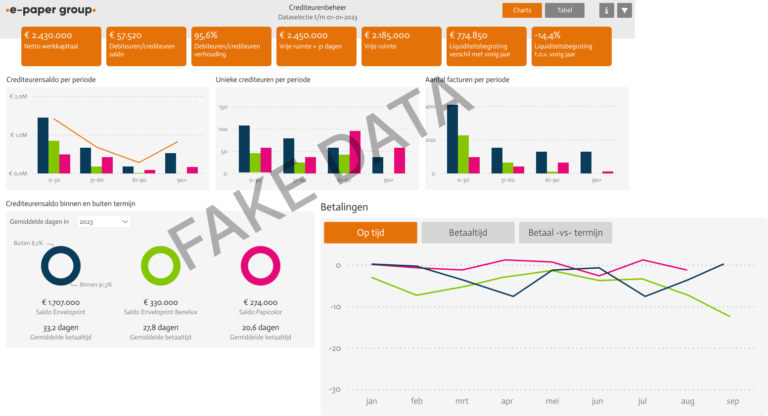 Het dashboard facturatie en orderintake is uitgesplitst per Business Unit (E-paper Group, Enveloprint, Enveloprint Benelux en Papicolor) en geeft de medewerkers van Enveloprint direct en snel een overzicht bij welke bedrijven ze voor- of achterlopen. Wanneer de halve cirkel vol is, dan betekent het dat ze de begroting hebben gehaald voor de desbetreffende periode.